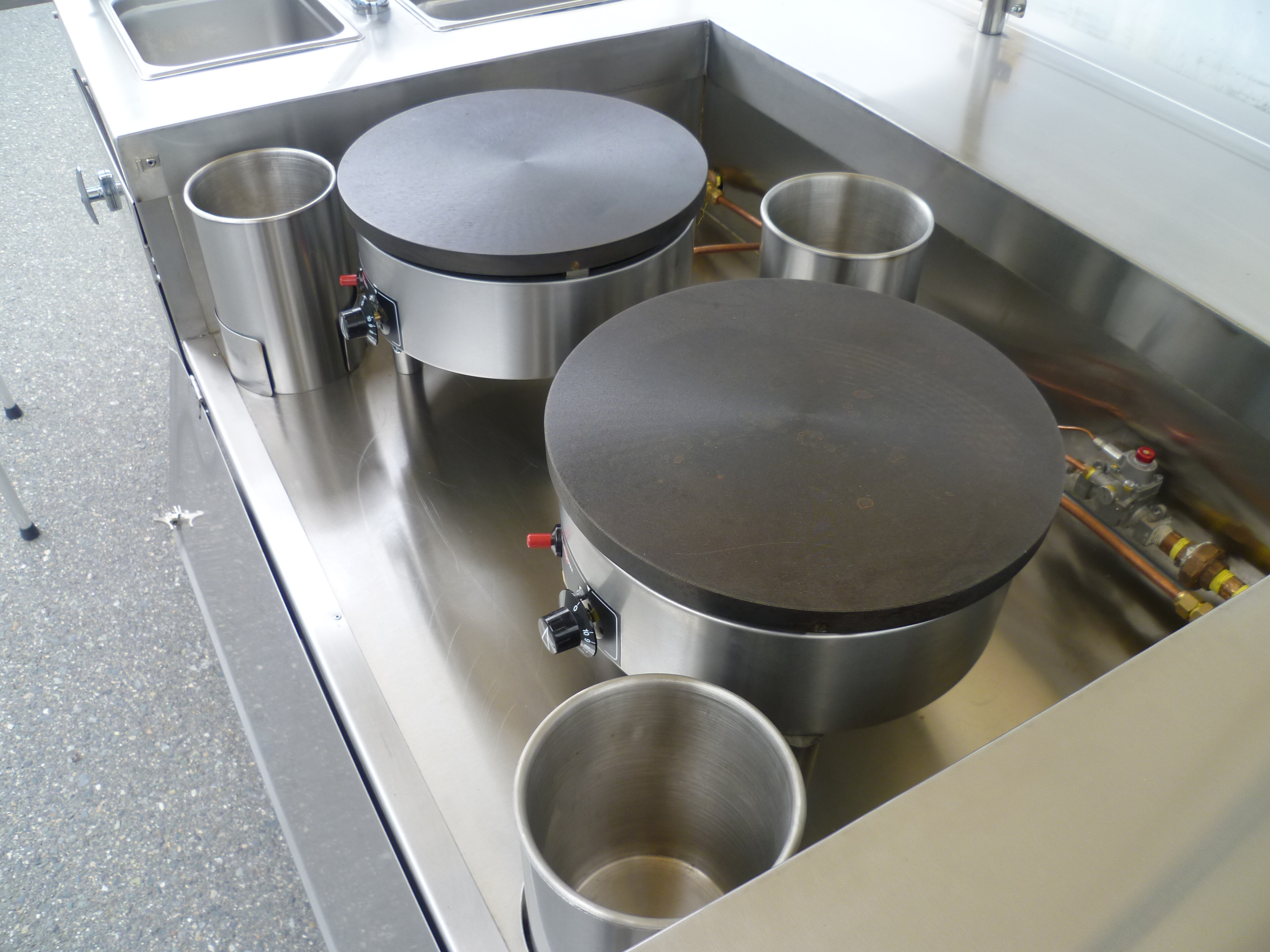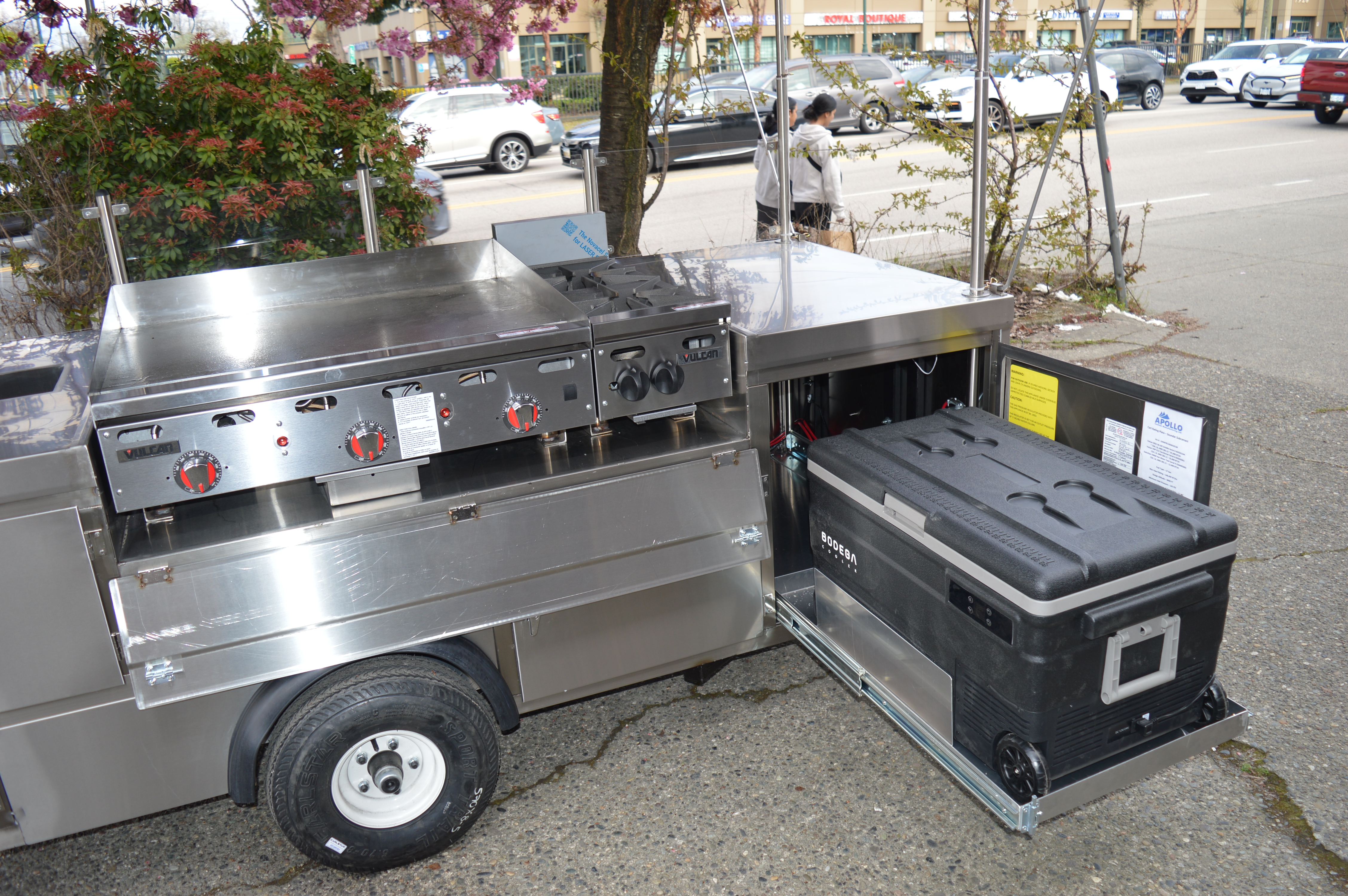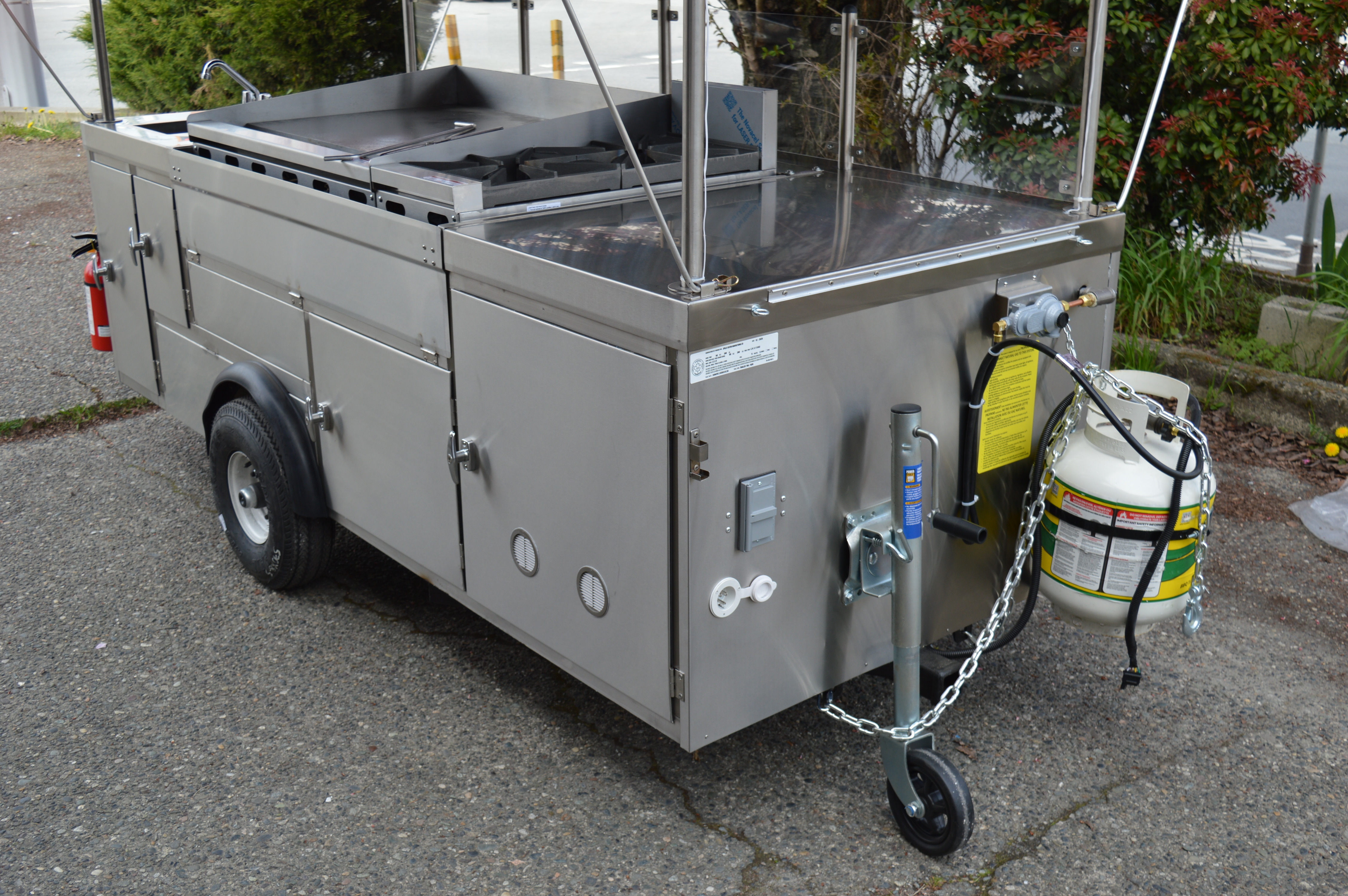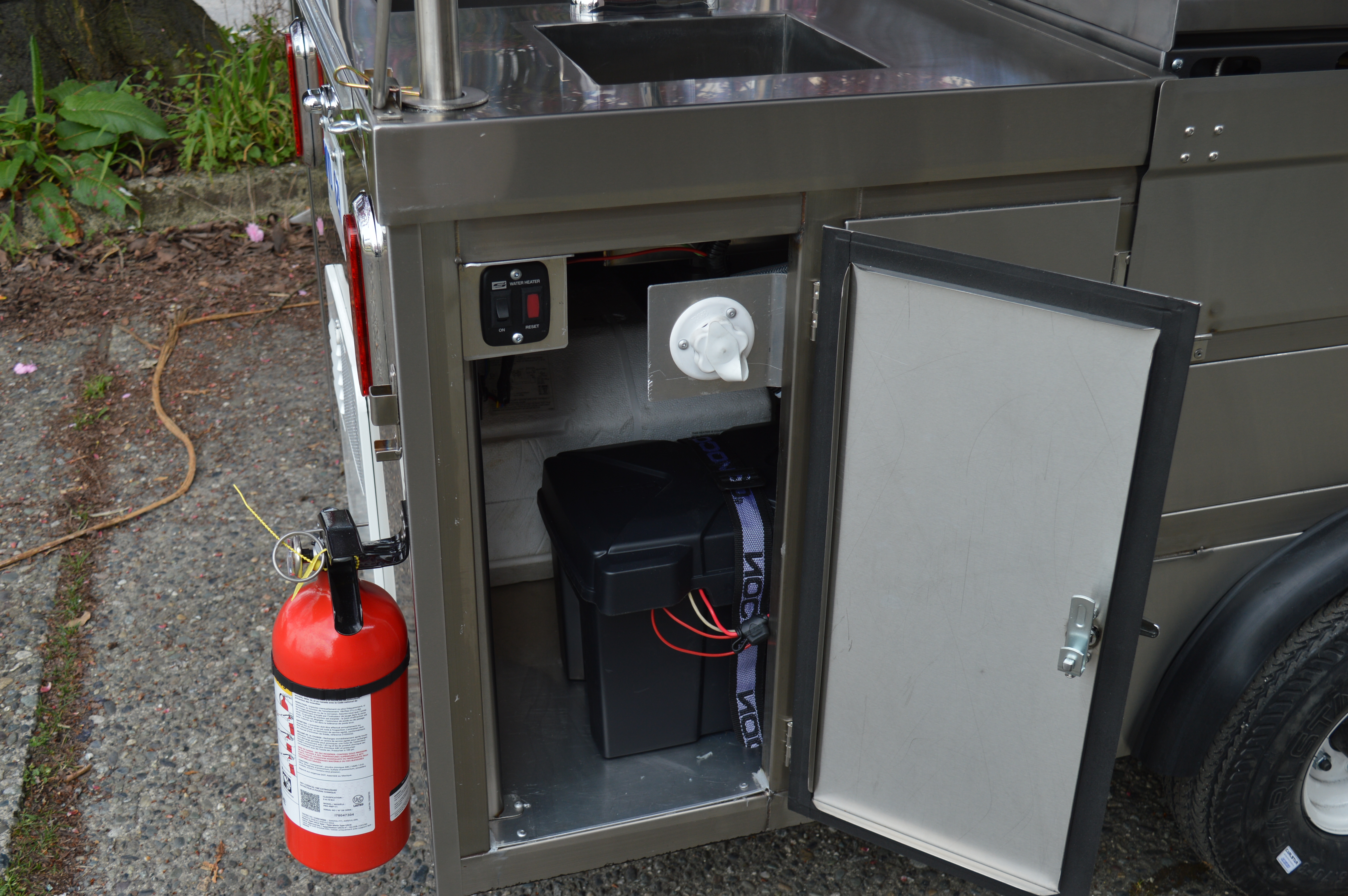 Double ware wash sinks – 10 x 10 x 6’’ deep– Customer to advise if different or cart will ship with double warewash Hand wash sink – 10 x 10 x 6’’ deep Hot and Cold Mixing Faucet 10 Imp Gallon / 45 Litre Fresh Water Tank 15 Imp Gallon / 68 Litre Waste Water Tank – Complete with dump valve and drain hose Shurflo on demand water pump 6 Gallon Suburban Water Heater – Propane Fired All water components are NSF and/or CSA approved